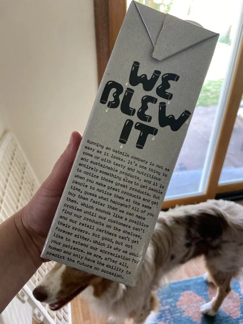 Running an oatmilk company is not as easy as it looks. It's one thing to come up with tasty and nutritious and sustainable products, and it is entirely something else to get people to notice those great products. But when you make great product and get people to notice them at the same time, guess what happens? All of you buy them faster than we can make them. Which sounds like a positive problem until our customers can't find our products on the shelves, and our retail partners can't get their orders. Not good, but not forever either. Which is why we would like to extend our appreciation for your patience. We are, after all, human and only have the ability to predict the future on occasion.